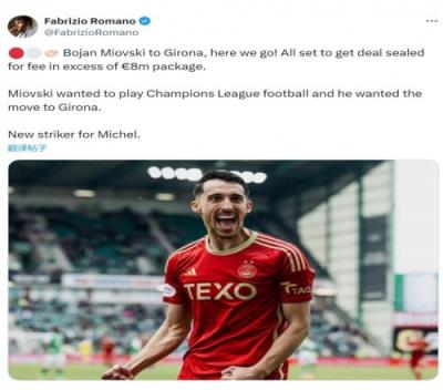 体育资讯8月12日报道宣 据知名记者罗马诺透露,赫罗纳将以超过800万欧总价签下阿伯丁中锋米奥夫斯基,Here we go!