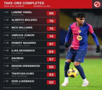 体育资讯12月28日报道宣称 squawka统计了西甲联赛2024年度成功过人情况,亚马尔以96次居首。