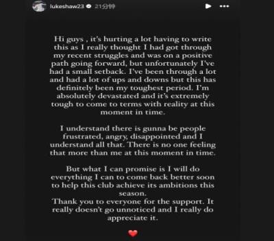 卢克肖通过社媒发文:“大家好,写下这些话让我很难过,因为我真的以为我已经度过了近期的困境,并走上了积极的前进方向。但不幸的是,我遭遇了一个小挫折。”