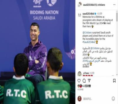 沙特世界杯申办委员会晒出了C罗与沙特小球员们见面的照片,并写道:“梦想参加2034年世界杯的年轻球员终身难忘的回忆!C罗给沙特年轻球员一个惊喜,加入他们一起参观了沙特申办2034世界杯的美妙计划!”