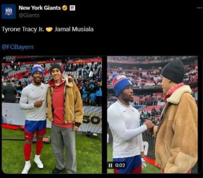 拜仁球星穆西亚拉也在现场观战,纽约巨人队官推晒出他与球队跑卫小泰隆-特雷西的合照,两人被拍到在场边亲切交谈,看起来关系不错,虽然从事项目不同,但运动员果然还是不分家。