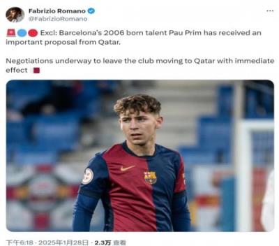 体育资讯1月28日报道宣称 据知名记者罗马诺的消息,巴萨18岁中场普里姆收到卡塔尔俱乐部的报价。