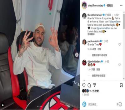 特奥社媒:很高兴为米兰在意甲攻入30球,抱歉马尔蒂尼