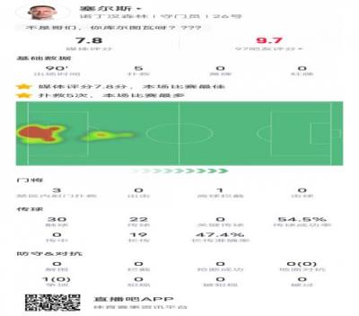 塞尔斯本场比赛数据:5次扑救全场最多,评分7.8全场最高
