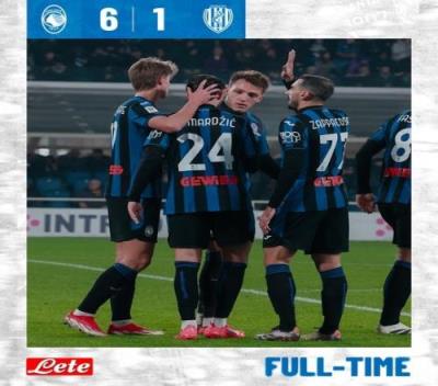 最终,亚特兰大6-1大胜对手挺进8强,下一轮他们将迎战博洛尼亚。