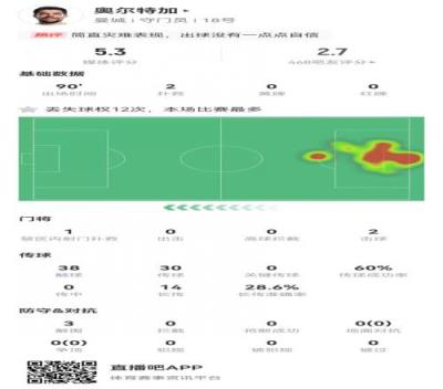 体育资讯2月3日报道宣称 曼城在本轮英超1-5惨败阿森纳,奥尔特加本场数据如下: