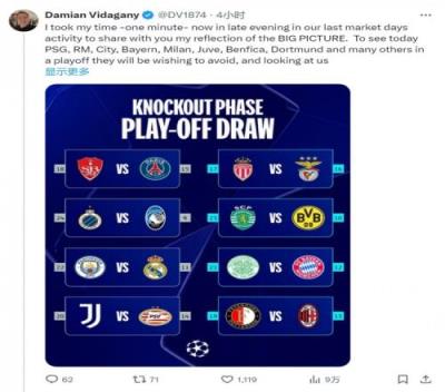 维达加尼晒出欧冠附加赛的对阵表,并写道:“在冬窗尾声阶段的晚上,我花一分钟的时间与大家分享我对整体情况的看法。看到巴黎、皇马、曼城、拜仁、米兰、尤文、本菲卡、多特和许多其他球队都得参加原本想要避免的附加赛,而我们最终却取得了更好的成绩,这让我为埃梅里、球员、蒙奇、老板和所有幕后人员的辛勤工作感到骄傲。”