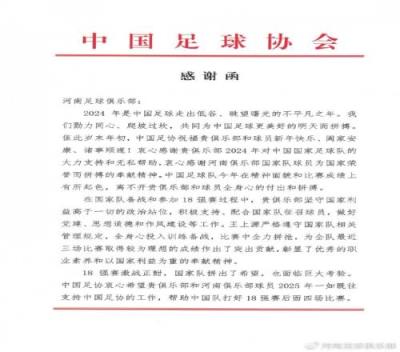 2024年是中国足球走出低谷、眺望曙光的不平凡之年。我们勠力同心、爬坡过坎,共同为中国足球更美好的明天而拼搏。值此岁末年初,中国足协祝福贵俱乐部和球员新年快乐、阖家安康、诸事顺遂!衷心感谢贵俱乐部2024年对中国国家足球队的大力支持和无私帮助,衷心感谢河南俱乐部国家队球员为国家荣誉而拼搏的奉献精神。中国足球队今年在精神面貌和比赛成绩上有所起色,离不开贵俱乐部和球员全身心的付出和拼搏。