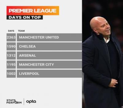 体育资讯12月23日报道宣称 Opta统计了各队处于英超榜首的天数,并列出榜单,目前的英超榜首球队利物浦以1002天排名第五位。
