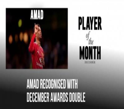 体育资讯1月3日报道宣称 曼联官方宣布,阿玛德包揽了12月的两项队内最佳奖项。他当选了队内12月最佳球员,他对阵曼城时的绝杀球当选最佳进球。