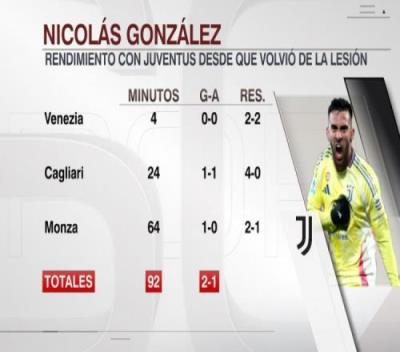 据ESPN统计,冈萨雷斯伤愈复出后参加3场比赛,其中1场首发2场替补,总计出场92分钟,打进2球送出1记助攻,参与3粒进球。