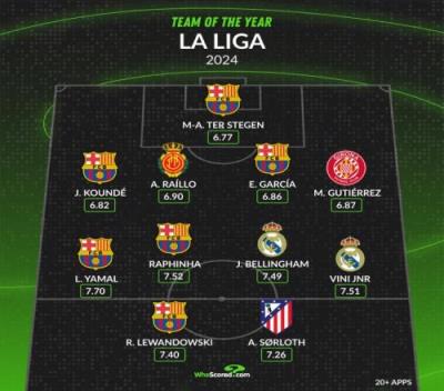 体育资讯12月24日报道宣称 WhoScored根据球员的场均评分排出西甲今年最佳阵容,莱万、亚马尔、维尼修斯、贝林厄姆在列,巴萨6名球员入选。