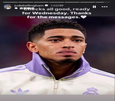 今天,贝林厄姆更新了社媒,向球迷报平安。他写道:“检查结果显示一切都好,我准备好了出战周三的比赛。感谢大家的问候。”