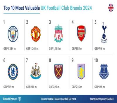 体育资讯08月12日报道宣 品牌评估机构Brand Finance发布2024英超俱乐部品牌价值榜单。曼城以13.84亿英镑,居首,曼联、利物浦分列二三位。