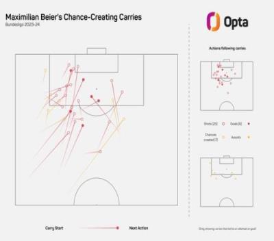 OPTA统计显示拜尔在上赛季德甲共计在持球推进情况下完成25脚射门并打进6球。这两项数据均为同期德甲第二,分别仅次于西蒙斯(莱比锡,27射)和吉拉西(斯图加特,也已转会多特,7球)。