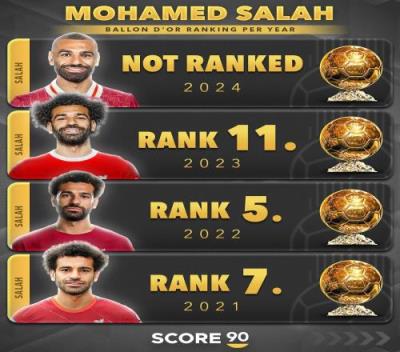 外媒score90晒出萨拉赫过往金球的排名,最高为两次排在第五,同时媒体表示萨拉赫仍然被低估。