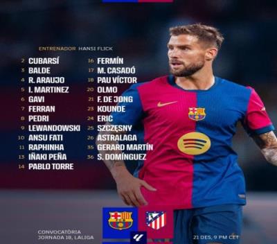 体育资讯12月21日报道宣称 北京时间明天凌晨4点,巴萨将在西甲第18轮比赛中主场对阵马竞,巴萨公布了此役的球员名单,亚马尔缺席,法蒂回归,莱万、拉菲尼亚、佩德里、阿劳霍在列。