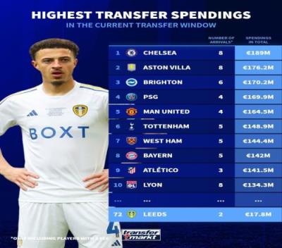 值得一提的是,利兹联排在这份榜单的最后一位,他们的支出为1780万欧元,转入了两名球员。