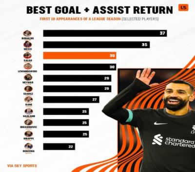 体育资讯1月3日报道宣称 媒体LiveScore统计了部分球员五大联赛单赛季前18场比赛参与进球的数量,并列出榜单,2014-2015赛季C罗参与37球居首,2010-2011赛季梅西参与35球次席,本赛季萨拉赫参与30球并列第三。