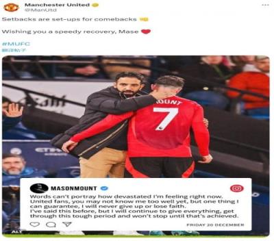 曼联官方社媒晒出芒特的社媒内容,以及主帅阿莫林拥抱芒特的照片,配文:“挫折是东山再起的铺垫,祝你早日康复,梅森(芒特)。”