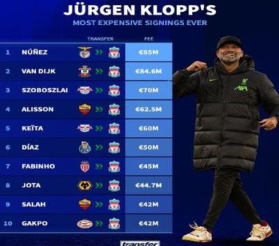德转列克洛普引援榜:努涅斯范迪克超8000万欧,阿利森萨拉赫在列