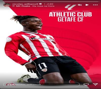 此役是西甲本赛季的揭幕战,毕尔巴鄂边锋尼科-威廉姆斯更新社媒动态,晒出个人比赛海报,内容为他滑跪庆祝的场景。