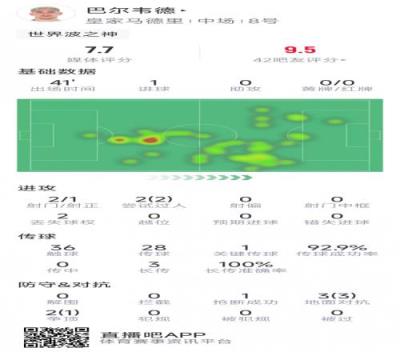 巴尔韦德本场数据:替补登场破门得分,5对抗4成功,评分7.7分