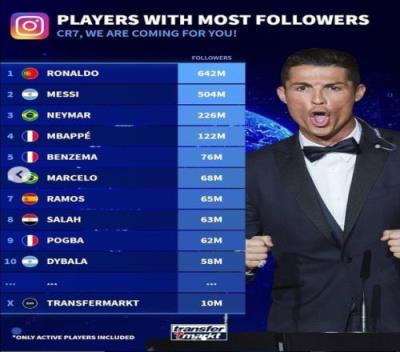 德转统计现役球员ins粉丝数:C罗6.4亿居首,梅西超5亿第二