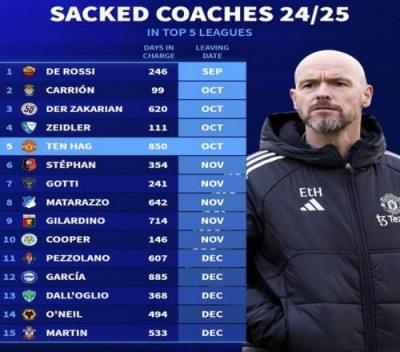 本赛季五大联赛15位主帅已下课:德罗西最早,滕哈赫执教时长第二