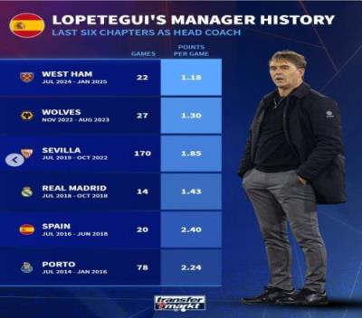 体育资讯1月9日报道宣称 西汉姆官方宣布主帅洛佩特吉下课,德转也盘点了洛佩特吉在执教近6支球队时的场均积分,以下为具体情况: