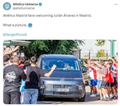 马竞球迷们也早已守候在此,并夹道欢迎这位新援来投。根据此前消息,阿尔瓦雷斯转会费总价高达9500万欧(7500万欧+2000万欧浮动),他与马竞将签约五年。