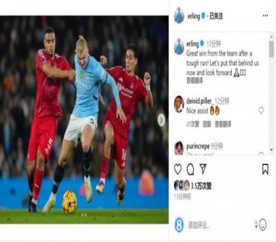 哈兰德在社交媒体上晒出比赛照片,并写道:“经历了艰难的旅程之后,球队取得了重要的胜利!现在让我们把此前的连败抛在脑后,向前看。”
