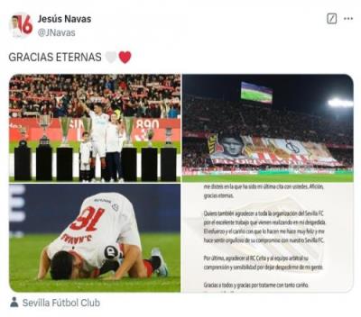 “最后,我要感谢塞尔塔、裁判团队的理解和体贴,让我能够与我的球迷告别。感谢所有人,谢谢你们对我的厚爱。加油,我的塞维利亚。”