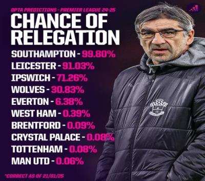 体育资讯01月21日报道宣称 2024-25赛季英超谁会降级?权威数据机构Opta利用超级计算机进行了10000次的模拟,模拟结果显示热刺和曼联两队均出现了小概率降级的情况。