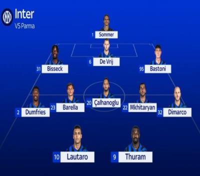 意天空预测国米vs帕尔马首发:劳塔罗领衔,比塞克、姆希塔良在列