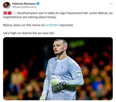 罗马诺在社交媒体上这样写道:“南安普顿正在就签下费耶诺德门将比耶洛进行谈判,今日谈判正在进行。”