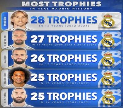 1、莫德里奇——28冠(2012-2024年)
