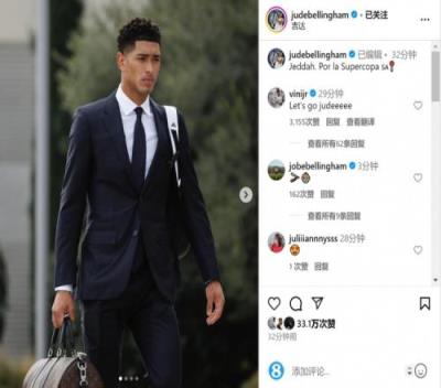 皇马中场贝林厄姆在社交媒体上晒出抵达吉达的照片,配文:“吉达,参加西超杯。”