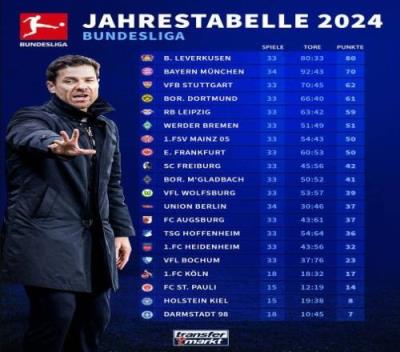 体育资讯12月26日报道宣称 2024-25德甲联赛已经进入冬歇期,德转统计了2024年自然年的“积分榜”,上赛季夺冠的勒沃库森高居榜首。