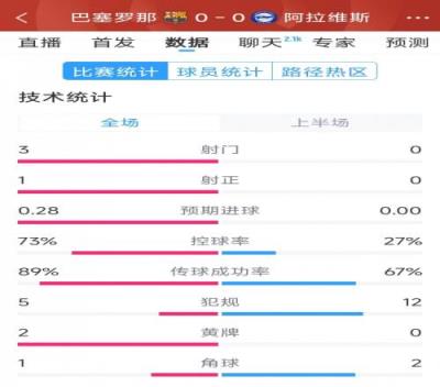 体育资讯2月2日报道宣称 本轮西甲巴萨对阵阿拉维斯上半场结束,双方暂时互交白卷。以下为双方半场数据对比: