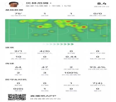 贝林厄姆本场比赛数据:传射建功&3过人成功2关键传球,评分8.4