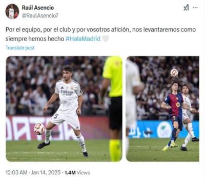 体育资讯1月14日报道宣称 西超杯决赛,皇马2-5不敌巴萨,无缘冠军。本场比赛中,皇马后防小将劳尔-阿森西奥在比赛第52分钟替补登场,目前他更新了社媒。