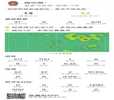 姆巴佩本场数据:5射仅1正,2次关键传球,5次成功过人