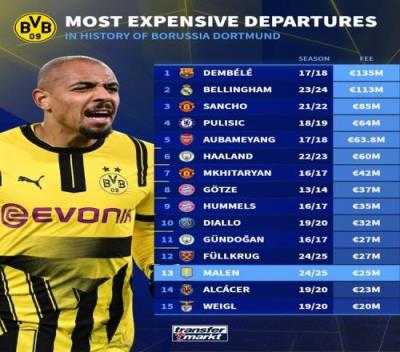 多特球员转会价格排名:登贝莱1.35亿欧居首,贝林次席&马伦第13