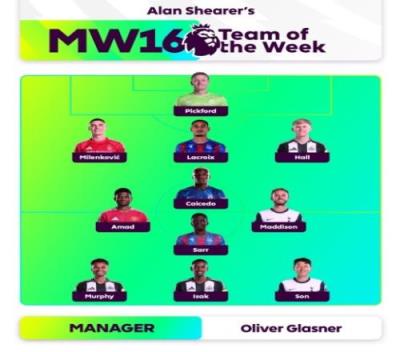 体育资讯12月17日报道宣称 今日,英超官方晒出名宿阿兰-希勒评选出的本周最佳阵容,阿玛德-迪亚洛入选,孙兴慜&麦迪逊在列,纽卡3人上榜。