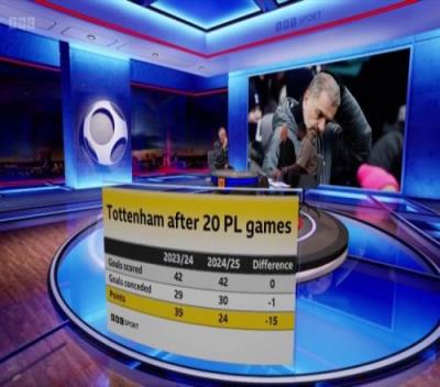 BBC统计了热刺近两个赛季英超前20轮的数据,并作出对比,两个赛季热刺同期进球、失球相当,但本赛季少了15分。