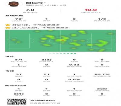 小图拉姆本场3射进1球1关键传球+6对抗4成功获评7.8分