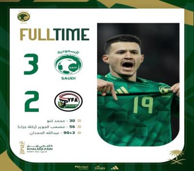 体育资讯12月26日报道宣称 第26届海湾杯B组第二轮也门对阵沙特,沙特在2球落后情况下3-2补时绝杀,取得海湾杯首胜。首轮,沙特2-3不敌巴林。