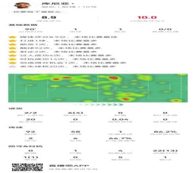 库尼亚本场1球1助攻,23对抗14成功+20丢失球权+5造犯规4抢断