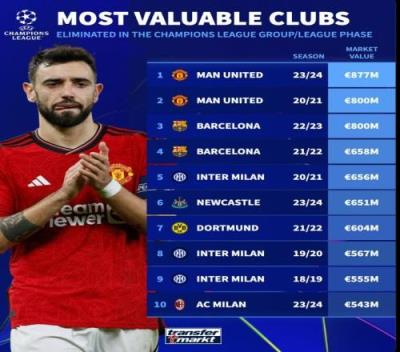 体育资讯1月29日报道宣称 本赛季欧冠联赛阶段末轮即将打响,巴黎、曼城仍有被淘汰的可能。德转也盘点了欧冠历史上第一阶段(包括此前的小组赛)被淘汰身价最高的球队,其中曼联、巴萨、米兰双雄都有上榜,具体情况如下: